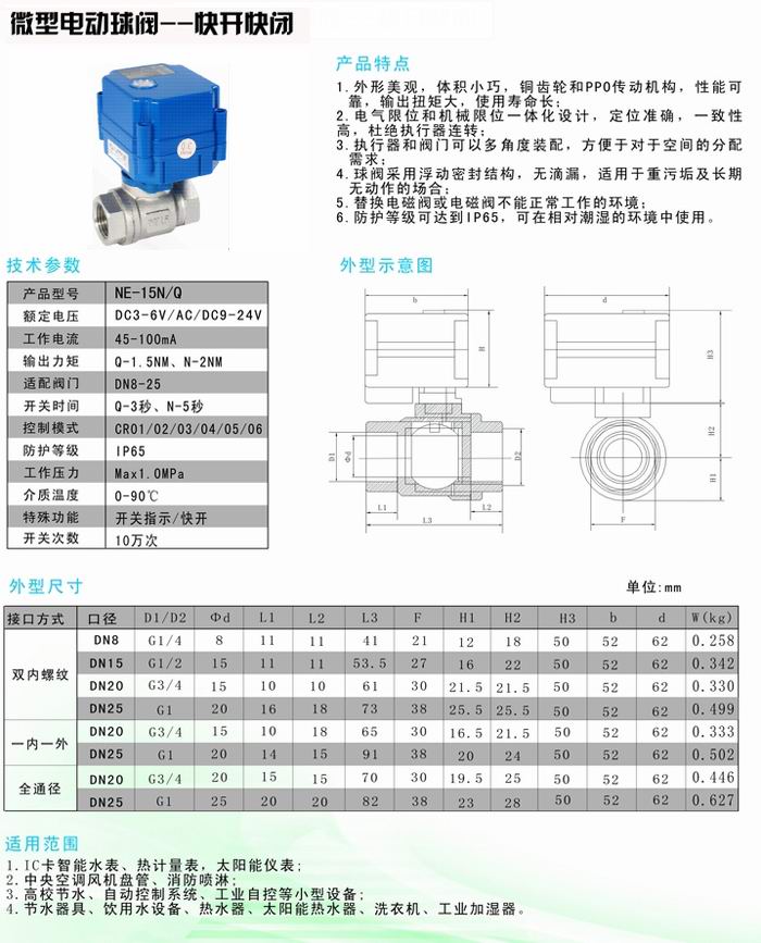 1、微型電動球執(zhí)行器外殼采用合金材料,外觀小巧精致、美觀耐用;傳動機(jī)構(gòu)采用全金屬齒輪,精密度高,力矩大。多種控制方式,既可以接受遠(yuǎn)程閥門控制信號,又可以反饋到位信號給智能檢測單元。