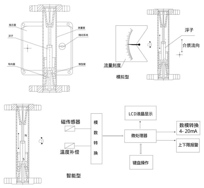 流量計主要有三大部分組成:1.測量管體;2.錐形浮子;3.指示器。浮子的位移量與流量大小成正比,通過磁耦合系統(tǒng),以不接觸方式,將浮子位移量傳給指示器指出流量大小。也可配合不同的轉(zhuǎn)換器,將流量值轉(zhuǎn)換成標準的電遠傳信號如4-20mA。實現(xiàn)距離遠傳顯示、記錄、積算和控制等功能。