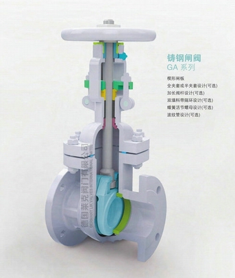 國(guó)標(biāo)閘閥的啟閉件是閘板,閘閥閘板的運(yùn)動(dòng)方向與流體方向相垂直,國(guó)標(biāo)閘閥只能作全開(kāi)和全關(guān),不能作調(diào)節(jié)和節(jié)流。大部分閘閥是采用強(qiáng)制密封的,即閥門關(guān)閉時(shí),要依靠外力強(qiáng)行將閘板壓向閥座, 以保證密封面的密封性。閘板有兩個(gè)密封面,最常用的模式閘板閥的兩個(gè)密封面形成楔形、楔形角隨閘閥參數(shù)而異,通常為50,介質(zhì)溫度不高時(shí)為2°52'。楔式國(guó)標(biāo)閘閥的閘板可以做成一個(gè)整體,叫做剛性閘板;也可以做成能產(chǎn)生微量變形的閘板,以改善其工藝性,彌補(bǔ)密封面角度在加工過(guò)程中產(chǎn)生的偏差,這種閘板叫做彈性閘板。