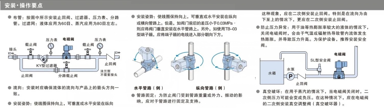 3、電磁閥不宜裝在管道低凹處,裝在容器的排出管道中,注意不可自容器底部引出,而應(yīng)裝在容器底部稍上位置。