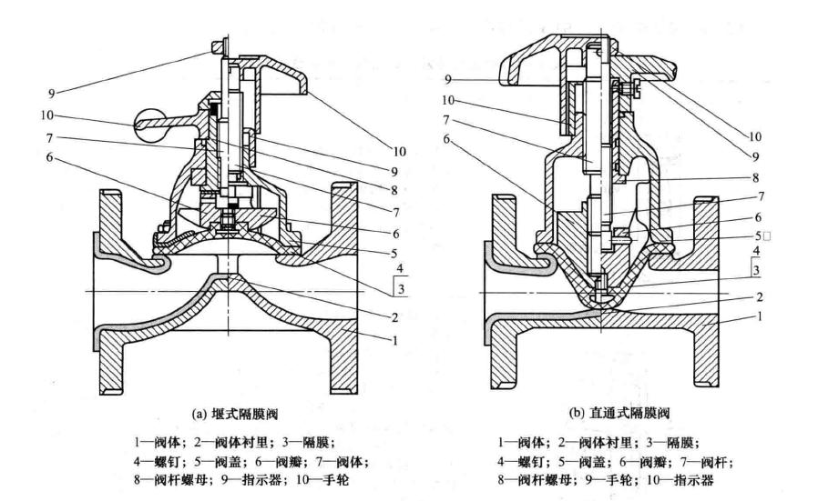 隔膜閥的關(guān)閉件-軟質(zhì)隔膜,由閥桿控制并做上、下運(yùn)動(dòng)以切斷介質(zhì)。具體隔膜閥內(nèi)部構(gòu)造圖如上圖所示。操縱機(jī)構(gòu)和介質(zhì)由隔膜隔開(kāi)。隔膜閥只有閥體和隔膜會(huì)與介質(zhì)相接觸,其他的閥桿等并不會(huì)接觸,因此常常用于衛(wèi)生級(jí)管道環(huán)境和有著特殊介質(zhì)接觸規(guī)定的環(huán)境。堰式隔膜閥和直通式隔膜閥的結(jié)構(gòu)如圖所示